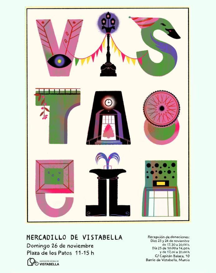 El próximo domingo 26 de noviembre por la mañana tendrá lugar en la Plaza de los Patos el MERCADILLO de segunda mano que la Asociación Vecinal de Vistabella organizamos todos los años.