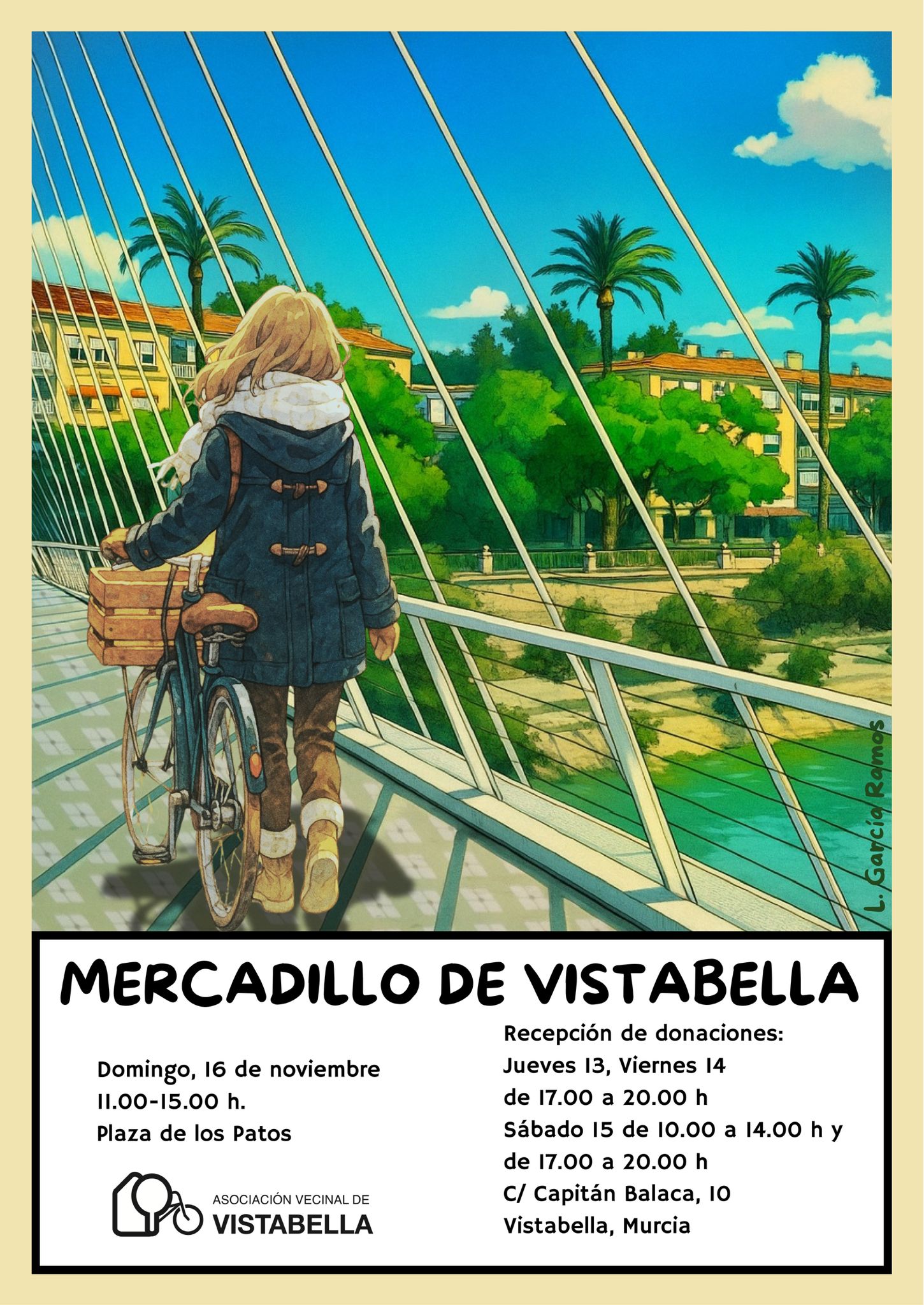 Asimismo, cada edición, el cartel del Mercadillo está realizado por una o un artista diferente que vive y/o trabaja en nuestro barrio. En esta ocasión, el cartel ha sido realizado por la artista y profesora de Artes Plásticas Lucrecia García Ramos.